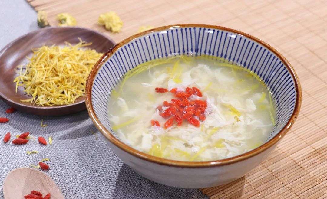 做法:将菊花蕾和灵芝片加水浸泡30分钟,再将它俩以及它们的浸泡水一起倒入锅中。大火煮沸后,转小火煮15分钟,捞起残渣留下汤汁。在汤汁中打入鸭蛋,煮熟后撒上菊花瓣和枸杞。