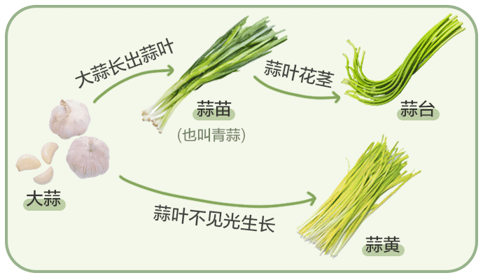 蒜可以说很全能,因为它的每个生长时期都可以用来食用,也就是我们经常吃到的蒜黄、蒜苗、蒜台。